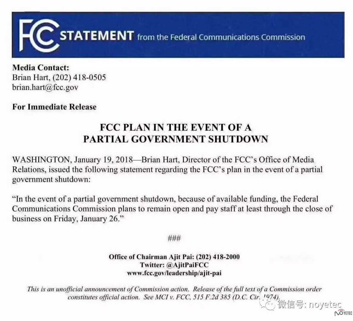 美国政府将在1月26号关闭FCC美国联邦通讯官方系统,直到美国政府支付他们应得的薪酬,具体恢复时间未知!