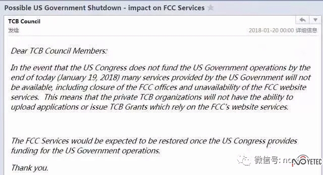 由于受到美国政府及FCC关闭的影响,一些需要上传的FCC项目也可能不得有所延期。TCB成员也收到了相关可能延期的邮件(下图来自天纵检测)