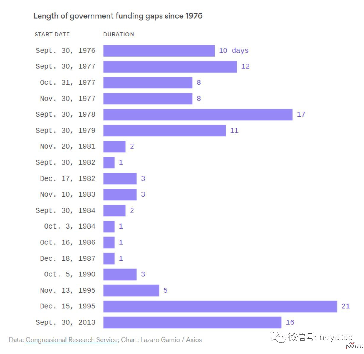 实际上,2013年10月,奥巴马就险些酿成政府关门的惨剧。最终,在多方商谈妥协后,白宫关闭了16天后继续运营(基本上等同于放个长假)。回顾历史,美国政府自1976年开始就经历了18次政府关门。不过,从关门时间看,基本上在1——21天不等,没有一次超过一个月。