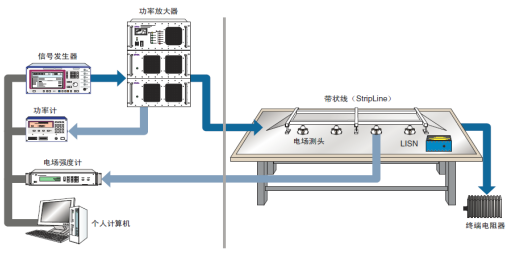 带状线法是通过一个带状天线的空间产生电场,对置于该电场的汽车电子系统的线束进行抗扰度试验的一种方法。适用频率较低,一般适用频率范围0.01MHz~400MHz。